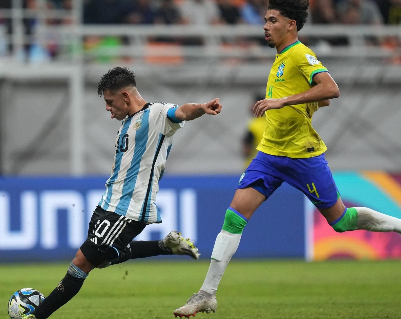 "Se lo vio bastante picante, ya lo estuvimos viendo. Tiene mucho para dar", Ángel Di María exclamó estos elogios luego de compartir este año una práctica en el predio de Ezeiza de la AFA con la joya del futuro del fútbol argentino, Claudio Echeverri. Ese mismo día, el nacido en Santiago del Estero hace 17 años, se sacó una foto para la eternidad con su ídolo: Lionel Messi. Fue un primer contacto con los consagrados campeones mundiales en Qatar y donde Echeverri sueña llegar algún día. Ayer, hizo algo que no fue capaz ni Messi ni Di María y tampoco Diego Maradona: marcarle en un Mundial de cualquier categoría tres goles al rival menos querido, Brasil. Con sus alaridos en el torneo ecuménico, llevó a los conducidos por Diego Placente a la cuarta semifinal de su historia. Una actuación al nivel de lo que se proyecta para el número 10 y capitán de este combinado juvenil que tiene a River como su máximo proveedor.