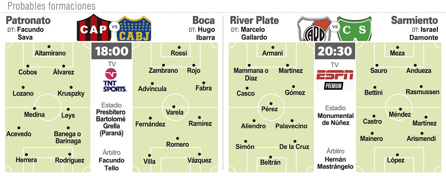 Por su lado, River Plate, en plena levantada, será local hoy frente a Sarmiento de Junín, que se juega la permanencia, en la continuidad de la undécima fecha. El encuentro comenzará a las 20.30 en el estadio Monumental del barrio porteño de Núñez, con arbitraje de Hernán Mastrángelo y transmisión de ESPN Premium. River cambió su cara en relación al inicio del torneo e hilvanó dos victorias en fila y sin goles en contra (1-0 a Gimnasia y Esgrima de La Plata y 3-0 a Aldosivi de Mar del Plata) para llegar a los 15 puntos en la tabla. Todo lo contrario es el presente de Sarmiento, que lleva dos caídas en fila y como visitante apenas sumó un punto sobre 15 posibles.