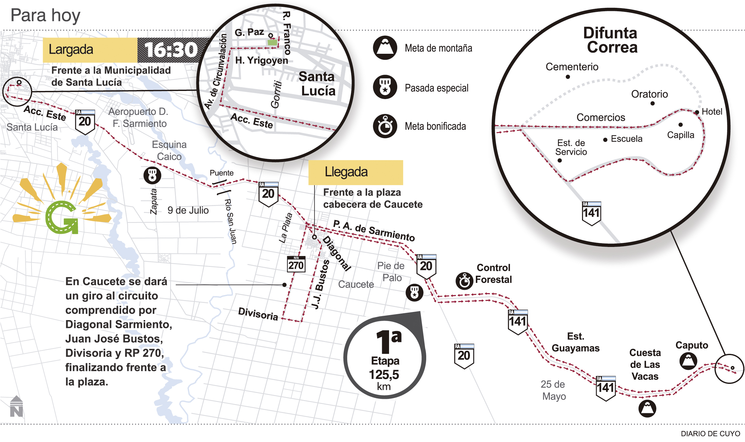 Para el tramo de apertura de las acciones del Giro del Sol se eligió un teatro de operaciones que pondrá a prueba los físicos de los pedalistas. Hay que viajar a la Difunta Correa. La etapa que saldrá de Santa Lucía y culminará en Caucete llevará al pelotón a sortear la exigencia de subir -de ida y vuelta- la Cuesta de las Vacas, con el plus extra que aportan la temperatura (se pronosticó 40´ de máxima a las 17) y el viento que, aún siendo leve, siempre castiga de costado cuando se encara hacia el Este por la Ruta 141.