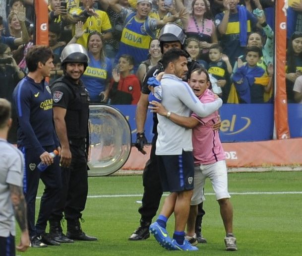 En ese contexto, un hincha que se introdujo en el campo de juego y que era controlado por la policía y la seguridad privada del club, se calmó cuando Tevez se acercó y le dio un abrazo ante una ovación.