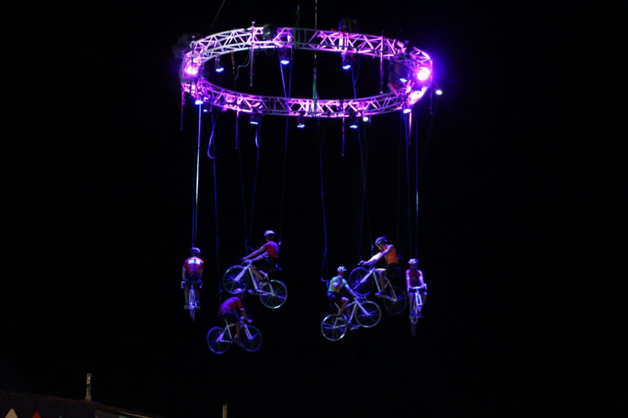 El ritmo se incrementó cuando comenzaron a zapatear los bailarines de malambo y se apreció en las alturas, a diferentes acróbatas subidos en bicicletas formando un círculo de pedaleros.