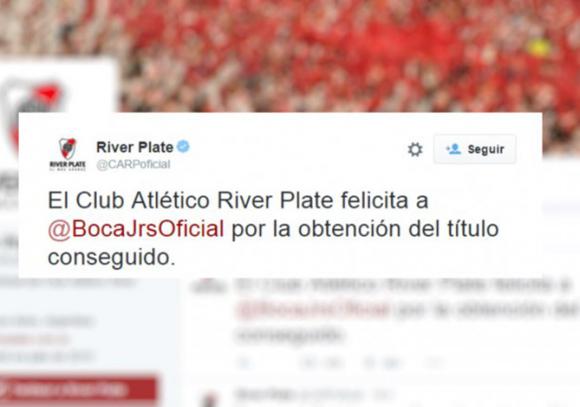 En tiempos donde no abunda la tolerancia, y a pesar del competitivo año que afrontaron las dos instituciones más poderosas del país a nivel nacional e internacional, los dirigentes del Millonario fueron artífices de un notable ejemplo para todo el fútbol argentino. La rivalidad quedó a un lado para felicitar al justo campeón. El mensaje apareció cerca de las diez de la mañana de ayer en la cuenta oficial de Twitter de la institución de Núñez y rápidamente generó un rebote espectacular en la famosa red social: miles de retuits, acompañamiento de simpatizantes del cuadro de Marcelo Gallardo y agradecimiento de los fanáticos de la entidad de La Ribera.