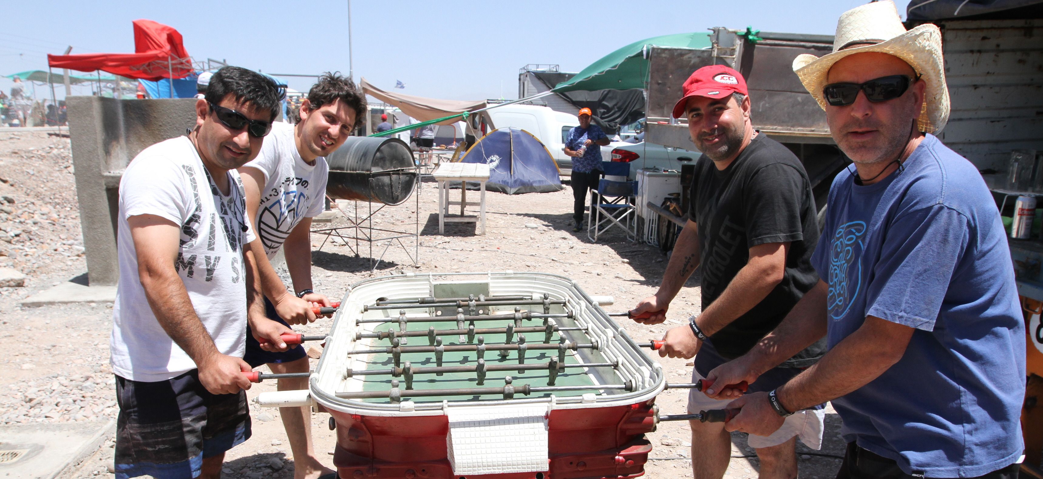 Son fanáticos de los fierros, pero para distraerse cuando los motores dejen de rugir, llevaron hasta El Villicum un metegol. Sí, cuatro fanáticos oriundos de la localidad mendocina de Maipú aprovecharon para distraerse jugando al fútbol. Se trata de Cristian Orellano, Rubén Lusi, David Marín, Santiago Sisti y Augusto Arean, quienes recorren todo el país siguiendo al Turismo Carretera. "No tenemos marca favorita, nos encanta el automovilismo en general", acotaron.