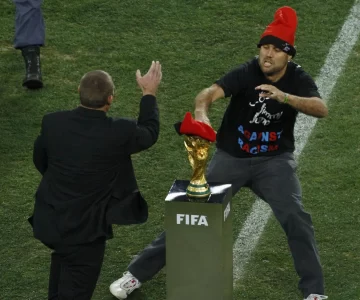 Sudáfrica, 11 de julio.- Antes de que los equipos salieran a la cancha, un hombre saltó desde la tribuna e intentó ponerle un gorro al trofeo, que por tradición, sólo puede ser tocado por los campeones.
