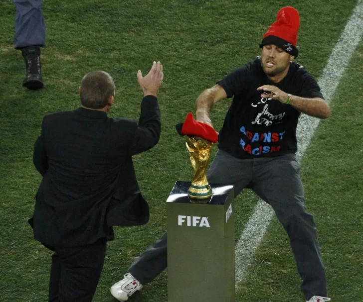 Cuando España y Holanda se disponían a salir al estadio Johannesburg SC para disputar la final del Mundial de Sudáfrica 2010, un hincha saltó desde las tribunas con dirección a la Copa del Mundo.