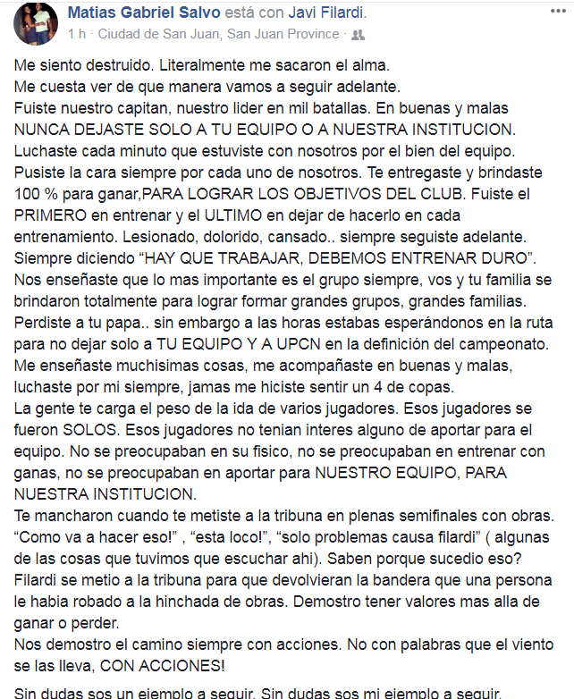 Quien en las últimas horas se expresó en las redes sociales dejando un emotivo mensaje para Filardi fue el sanjuanino Matías Salvo. Momentos después, llegó la respuesta del ahora excapitán.