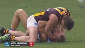 Buenos Aires, 21 de julio.- Una imagen increíble se vivió en un partido de Fútbol australiano. Brian Lake, de Hawthorn Hawks, intentó morder y estrangular a Drew Petrie, de North Melbourne. Fueron unos segundos de tensión ya que, a pesar del esfuerzo, no lograban sacarlo de encima de su rival. Una locura.