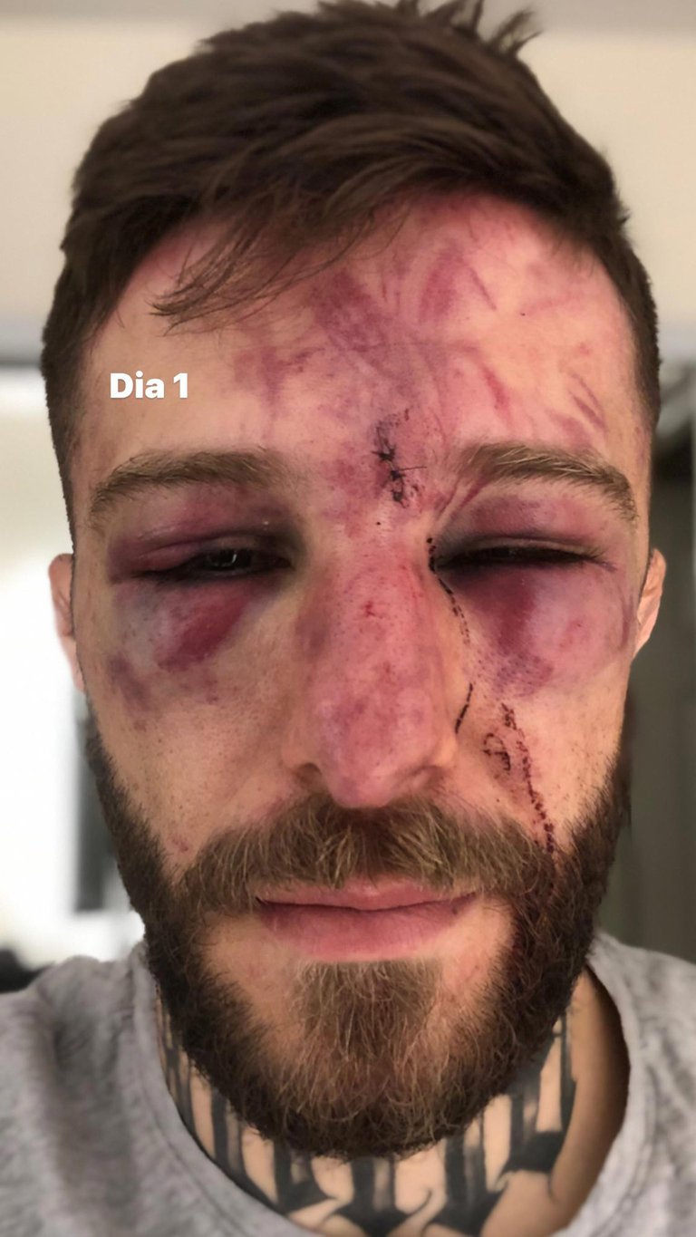 Un día después de su debut y tras la brutal paliza que recibió, el argentino publicó una nueva foto en sus stories que tituló como “Día 1”, con el rostro menos hinchado pero con el ojo izquierdo prácticamente cerrado y más dañado que el derecho.