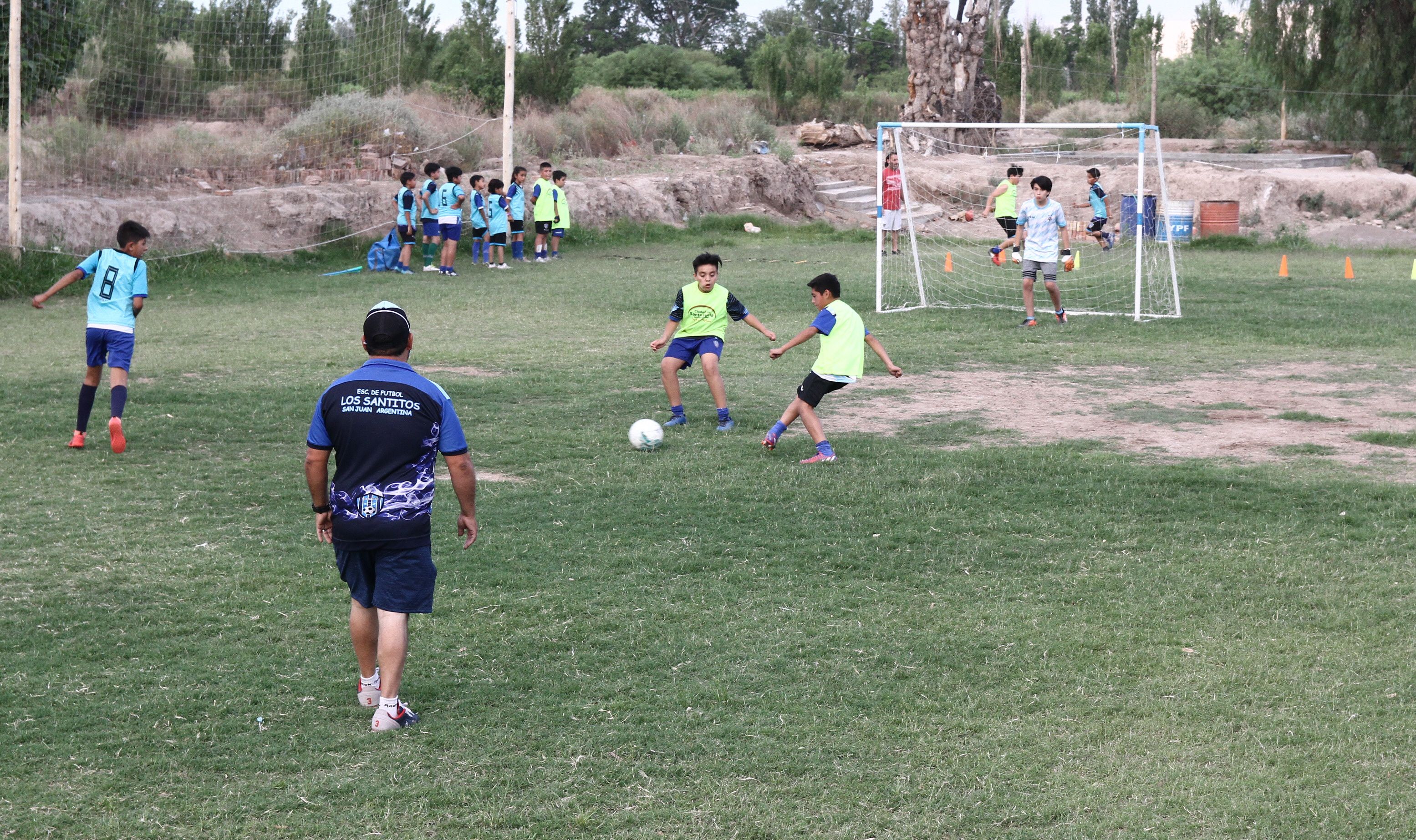 Ubicado en Alto de Sierra, Santa Lucía, la escuelita de fútbol comenzó hace cinco años. Un grupo de amigos armaron un rejunte para jugar un torneo municipal y salieron campeones. Esa motivación los llevó a seguir entrenando y así fue que continuaron, incluso con el nombre que ellos mismos se habían puesto. "Los Santitos" entrenaban como nómades, pedían canchas prestadas o alquilaban predios. Hasta que un día, cuando llevaban 2 años, uno de los profes, Daniel Zambrano, decidió ir más allá y poner a disposición un terreno -propiedad de su padre- en aquel lugar. "Hacer un quincho con pileta era el boom del momento pero el entusiasmo de mi hijo Santiago de querer tener la cancha para jugar al fútbol con sus amigos, fue mi motor", comentó Daniel, quien con su pequeño, en ese momento de 10 años, comenzaron a trabajar en el lugar. Dice que fueron largas tardes bajo el sol, acarreando escombros hasta que llegó la ayuda del municipio, quien colaboró con las máquinas y tractores para agilizar notablemente la nivelación del terreno.