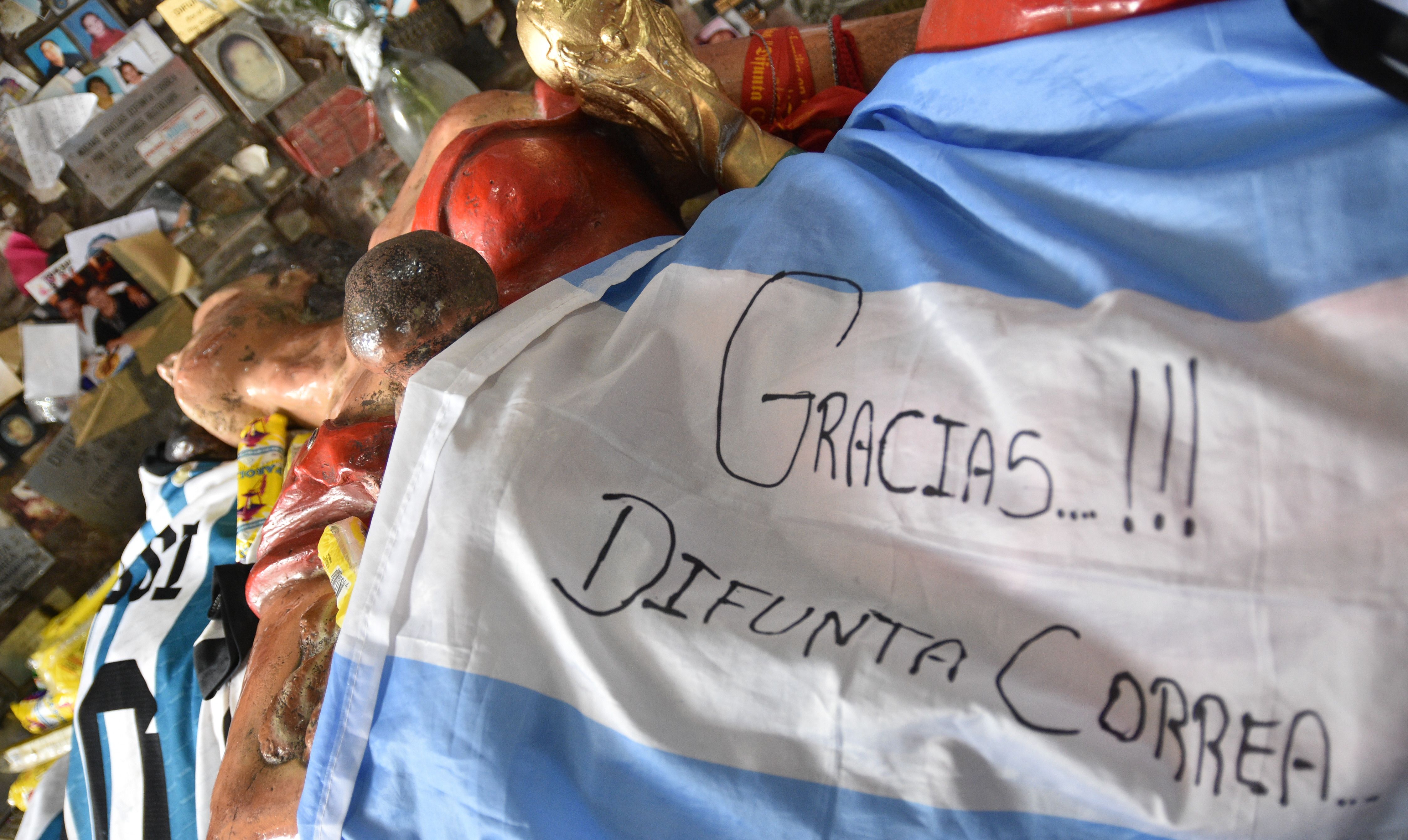 Devoción. Distintos profesantes de la Difunta dijeron presente ayer en el paraje de Vallecito y le ofrendaron, por ejemplo, banderas y camisetas de la Argentina.