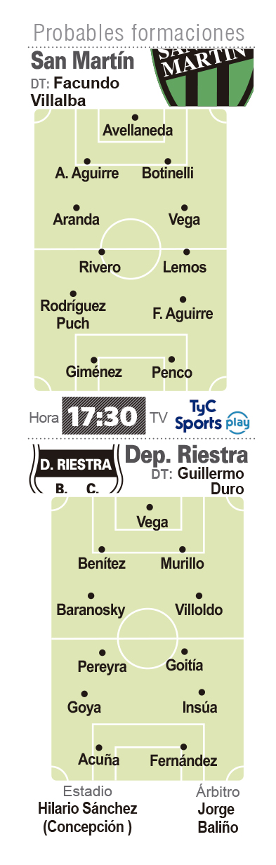 En lo futbolístico, todo indica que San Martín pondrá en cancha los mismos once de la fecha pasada: Avellaneda en el arco; la línea de fondo con Aranda, Aguirre, Botinelli y Vega; el medio con los externos Rodriguez Puch y Franco Aguirre más los centrales Rivero y Lemos; mientras que en el ataque, Giménez junto a Penco.