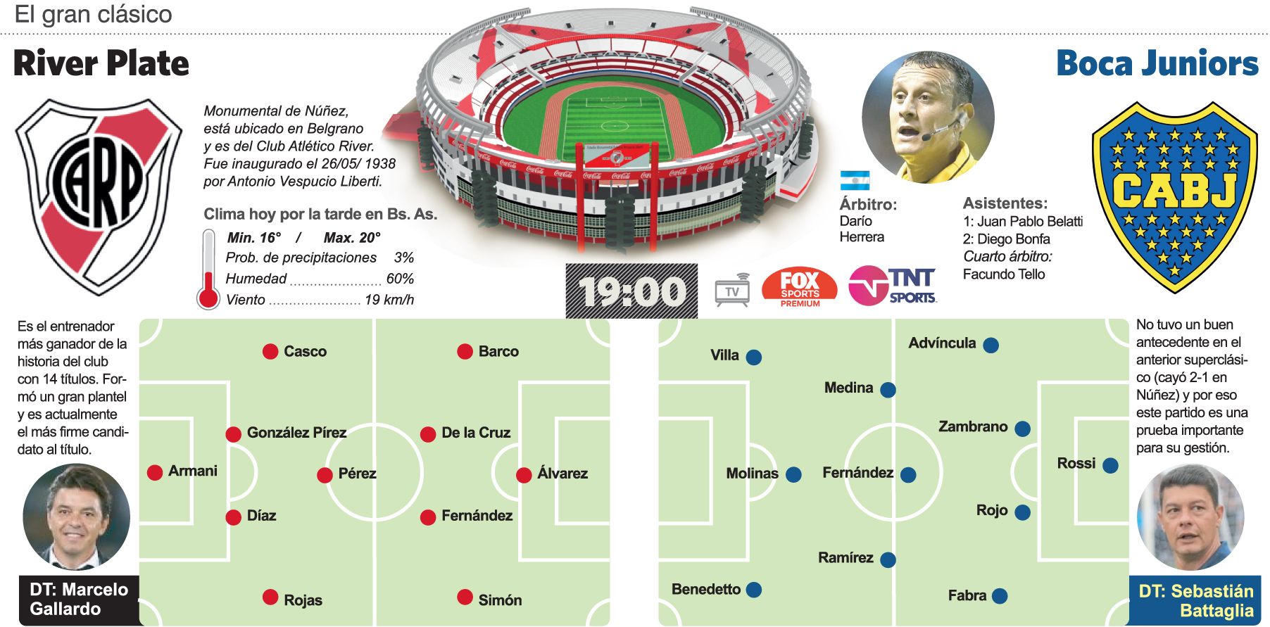 En el superclásico más reciente, que River ganó 2-1 en Núñez, el 3 de octubre del año pasado, Boca jugó en inferioridad numérica desde los 15 minutos por la expulsión del defensor Marcos Rojo. Con camiseta alternativa -amarilla- por primera vez en un superclásico oficial, el "Xeneize" presentará dos cambios en su formación titular: el peruano Carlos Zambrano por el lesionado Carlos Izquierdoz en el ataque y la vuelta del goleador Darío Benedetto por Luis Vázquez en el ataque.