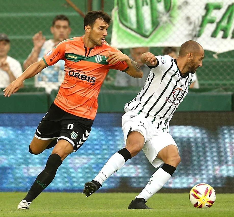 Marca. El defensor de San Martín, Gonzalo Prósperi, controla el balón ante la presencia del atacante de Banfield, Nicolás Bertolo.