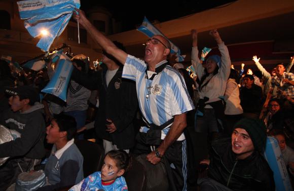 No importó si se conocían o no, pero los hinchas terminaron abrazados y a los gritos. Fueron gritos de desahogo y alegría, que liberaron la tensión de 90 minutos. El Teatro Municipal de repente estalló en festejos y nadie quedó sentado, los asistentes explotaron en un solo aliento y no faltaron las trompetas y papelitos arrojados al aire. Luego, las personas que estuvieron en el complejo se cruzaron a la Plaza 25 y entre los que llegaron de distintas partes se armó el baile alrededor de una murga, en la siesta más feliz. Fueron los festejos albicelestes de los sanjuaninos que estuvieron en el centro, tras la victoria de Argentina sobre Irán que le dio la clasificación a octavos de final del Mundial Brasil 2014.