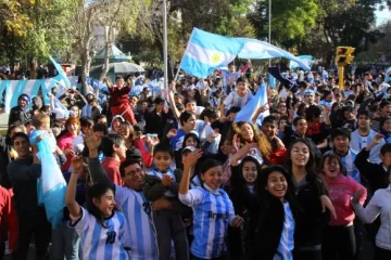 Cinco minutos fueron suficientes para que la Plaza 25 de Mayo y sus alrededores quedaran teñidos de celeste y blanco. Las banderitas colgadas en los manubrios de las bicicletas o flameando en las ventanillas de los autos. Los colectiveros que tocaron las bocinas hasta ensordecer. Y los niños que lloraban junto a sus padres de alegría fueron algunas de las postales que se vieron ayer en los festejos sanjuaninos por el pase a Cuartos de final de la Selección argentina.