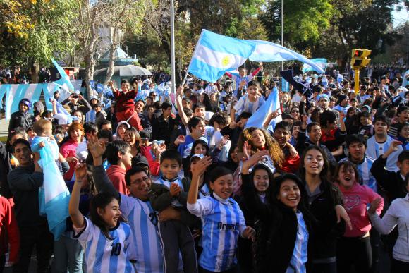 Bengalas de humo celestes y blancas le pusieron más color a la tarde en la que no hubo una cara sin sonrisa. Y al igual que en todos los festejos anteriores no faltaron las banderas, los gorritos y las pelucas. Tampoco las cornetas, las bombas de estruendo y el infaltable ‘el que no salta es un inglés’. Todas estas canciones acompañaron los bocinazos de los autos que también dieron vueltas a la plaza incontable cantidad de veces.
