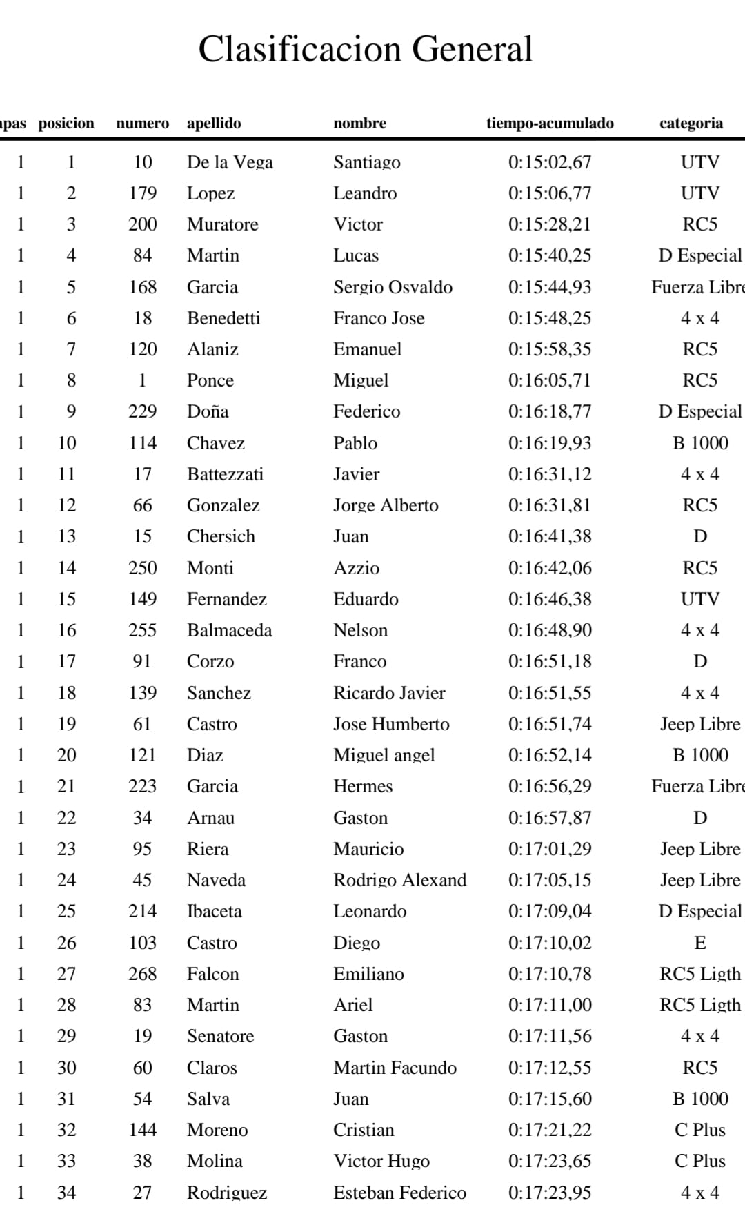 Con más de 150 pilotos, máquinas de última generación y aquellas que solo participan de esta carrera, miles de aficionados al automovilismo alentando el paso de las máquinas y la capacidad hotelera del departamento al 100%, el rally vallisto en su 30º edición culminó su primera etapa liderada por Santiago De La Vega, en un UTV, registrando un tiempo de 0:15:02,66.