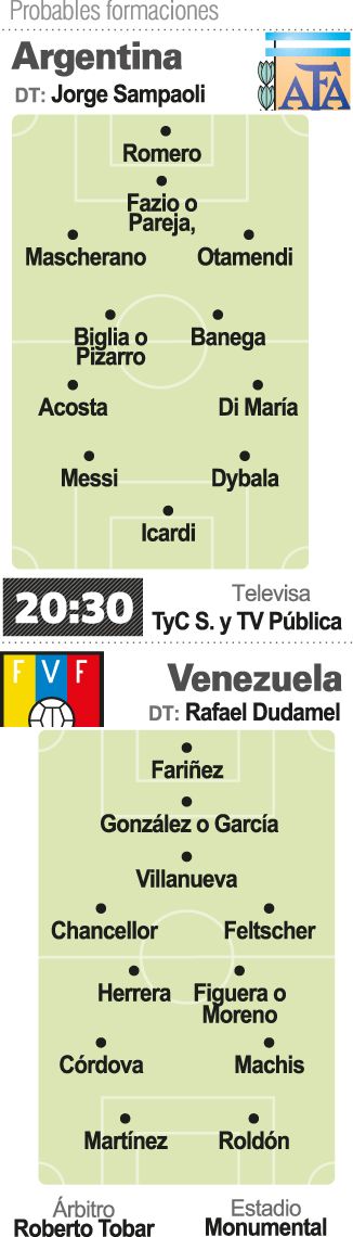 En su primer partido oficial, el jueves pasado ante Uruguay (0-0), Sampaoli propuso un equipo tan ofensivo como el que presentará hoy, y volverá a intentar llegar al gol con Lionel Messi, Mauro Icardi y Paulo Dybala. El dibujo que propone es similar, con un 3-4-3, con Acosta y Ángel Di María (con Uruguay siguió sin hablar el mismo idioma de juego con la selección) por las bandas. Uruguay le cerró los espacios y sólo un par de veces los argentinos lograron hallar la grieta con un par de acuerdos entre Messi y Dybala. Ahora de local y ante la eliminada y débil Venezuela Sampaoli tiene otra oportunidad, aunque de no acertar se le acotarían fuertemente las chances de clasificar directamente. Venezuela le viene como anillo al dedo a Argentina, porque además de estar eliminada, sacó puntos en sólo cinco de quince partidos y únicamente ganó uno. Encima, la "vinotinto" llega sin Tomás Rincón, suspendido por acumulación de amarillas y por ende el entrenador Rafael Dudamel no podrá contar con uno de los mejores futbolistas.