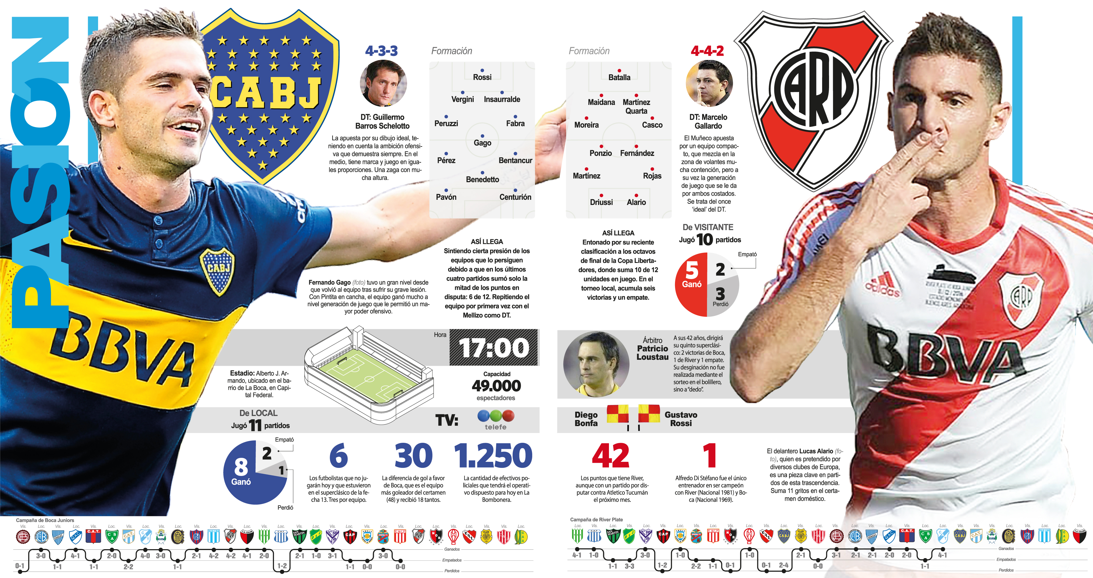 El encuentro comenzará a las 17, lo dirigirá Patricio Loustau, será televisado en directo por Telefe y contará con un amplio operativo de seguridad que tendrá alrededor de 1.500 efectivos. El resultado entre los dos colosos del fútbol doméstico repercutirá en el camino que resta para conocer al campeón porque de ganar Boca, el líder, dará un paso fundamental hacia la obtención del título.