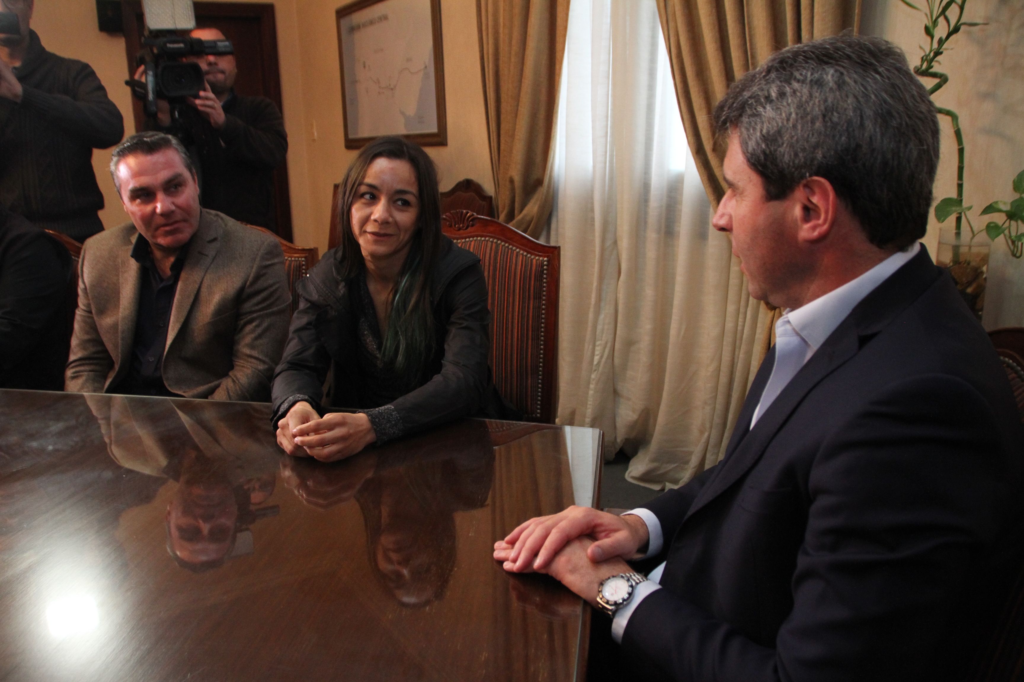 Cerca de las 10, el gobernador Sergio Uñac se encontró con la flamante campeona mundial gallo, Cecilia Román, a quien no solamente felicitó por el título obtenido sino que le entregó una placa recordatoria.