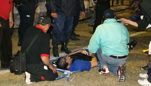 Lo más relevante pasó cerca del final de la etapa, a los 37 minutos, cuando el arquero de Trinidad Andrés Lavorante, fue víctima de la violencia. Un hincha de Unión arrojó una bomba de estruendo al campo de juego y cayó muy cerca de donde se encontraba Lavorante. El árbitro inmediatamente decidió suspender el partido para que el arquero sea atendido. El “Oso” estuvo inconsciente durante un tiempo prolongado, por lo que tuvieron que llamar a una ambulancia (no había ninguna en el estadio) para llevarlo al hospital Rawson.