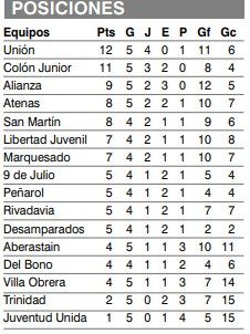 El Torneo de Invierno del fútbol sanjuanino en Primera División tuvo ayer cuatro encuentros que abrieron la 5ta fecha. Unión logró una valiosa victoria ante Juventud Unida, por 4 a 1, y pasó a ser el único puntero del torneo. Además, Colón no pudo ante Trinidad y empató 2 a 2, mientras que Alianza igualó 1 a 1 ante Aberastain y Atenas venció por 2 a 0 a Villa Obrera. Hoy desde las 16,30 jugarán: Peñarol-Rivadavia, Del Bono-9 de Julio y Libertad-Desamparados.