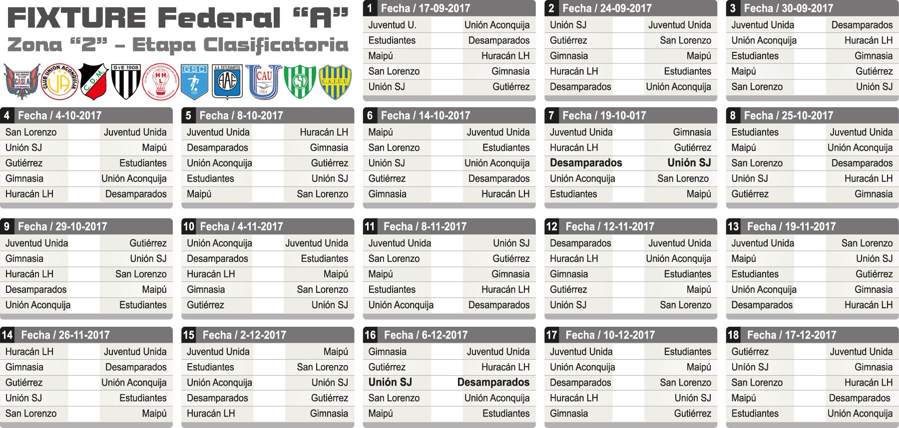 Se terminó la espera y adiós a las especulaciones. El Consejo Federal dio a conocer ayer al mediodía el fixture y formato del Federal "A" para la temporada 2017-2018 que comenzará el domingo 17. Así, Desamparados y Unión de Villa Krause conocieron el camino que deberán recorrer para pelear por un ascenso a la "B" Nacional.