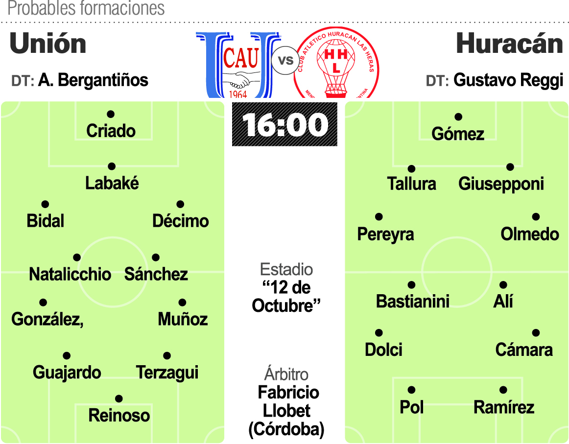 La dura derrota en Puyuta ya quedó atrás y Unión sabe que hoy es el momento de remontar. El "Azul" recibirá en el "12 de Octubre" a Huracán Las Heras desde las 16 y con arbitraje de Fabricio Llobet. Bergantiños no logra encontrarle la vuelta al equipo, por eso hoy realizará cuatro variantes. Con los ingresos de Martín Bidal, Eduardo González, Hernán Muñoz y Marcelo Guajardo, Unión cambiará el esquema para pasar a jugar con un 3-4-1-2, siempre manteniendo a la dupla de delanteros entre Terzaghi y Reinoso. Enfrente tendrá a Huracán que se encuentra lejos del objetivo para el cual se armó, último en la tabla y todavía sin conocer la victoria. Hoy estrenará a Gustavo Reggi al mando tras la salida del "Bichi" Fuertes.