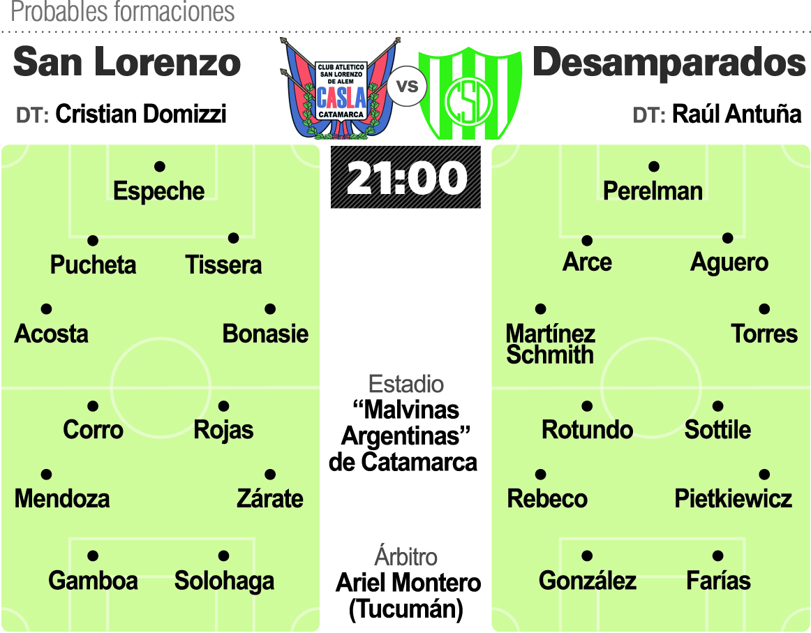 Sportivo, que viene de golear en el clásico al Azul, visitará a San Lorenzo de Alem en Catamarca desde las 21 y con arbitraje del tucumano Ariel Montero. Desamparados aspira a seguir con su racha que le permita seguir liderando la zona y sabe que de visitante casi siempre pudo sumar. De los cinco encuentros disputados en esta condición, le ganó a Estudiantes y Gutiérrez, empató ante Huracán Las Heras y sólo perdió contra la Juve puntana. Sportivo va encontrando de a poco el nivel de juego que pretende Antuña y algo pudo plasmar en el choque ante Unión. Por eso, el técnico puyutano repetirá equipo nuevamente con el clásico esquema 4-4-2 y teniendo únicamente como novedad a Pablo Jofré disponible entre los suplentes. Enfrente tendrá a San Lorenzo de Alem que viene de perder el clásico ante Unión Aconquija, obligando a que su técnico Cristian Domizzi presentara la renuncia que no fue aceptada por la dirigencia.