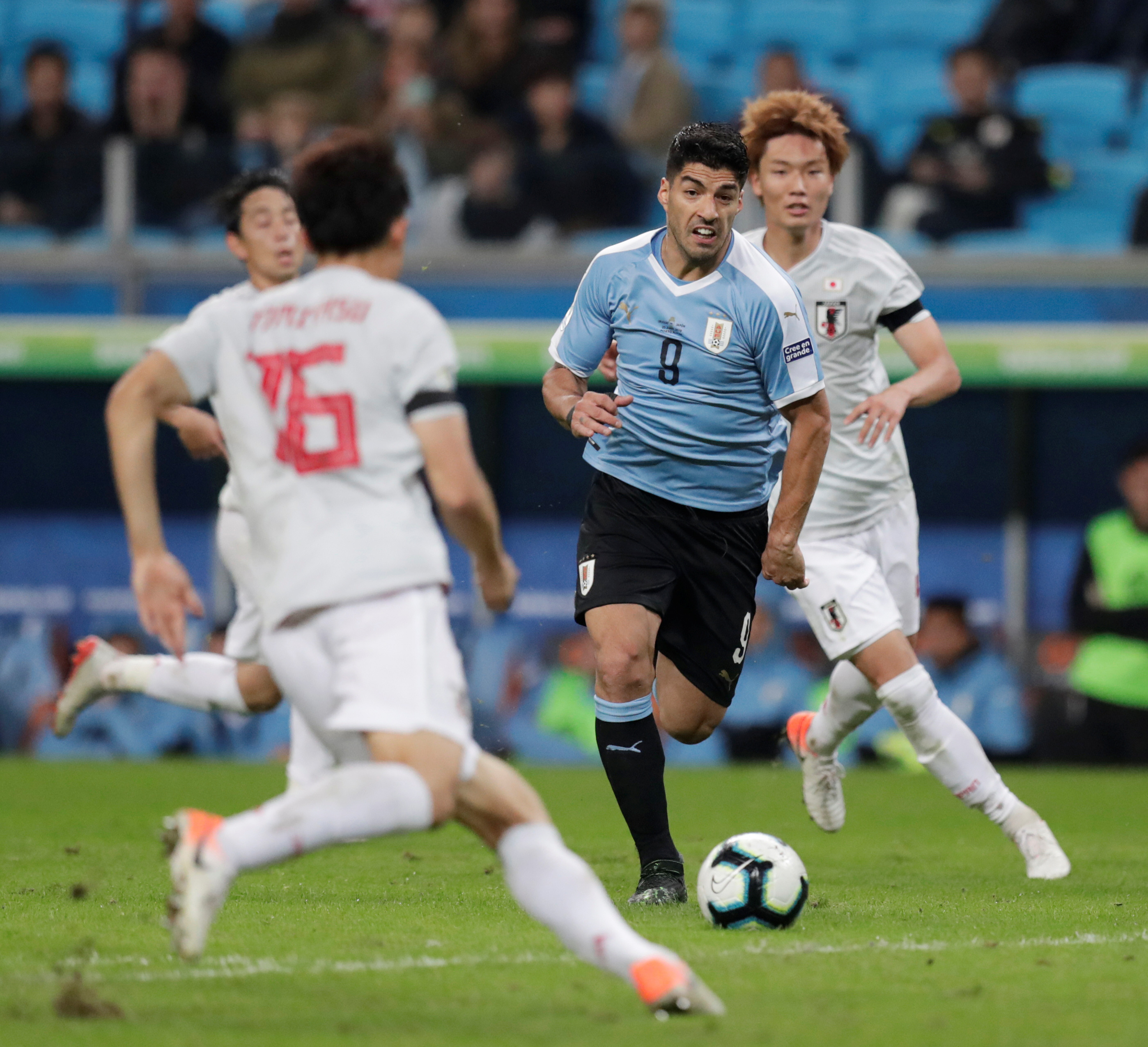 Al acecho. Luis Suárez anotó el primer gol de penal para Uruguay, en un partido que se le complicó demasiado ante Japón.
