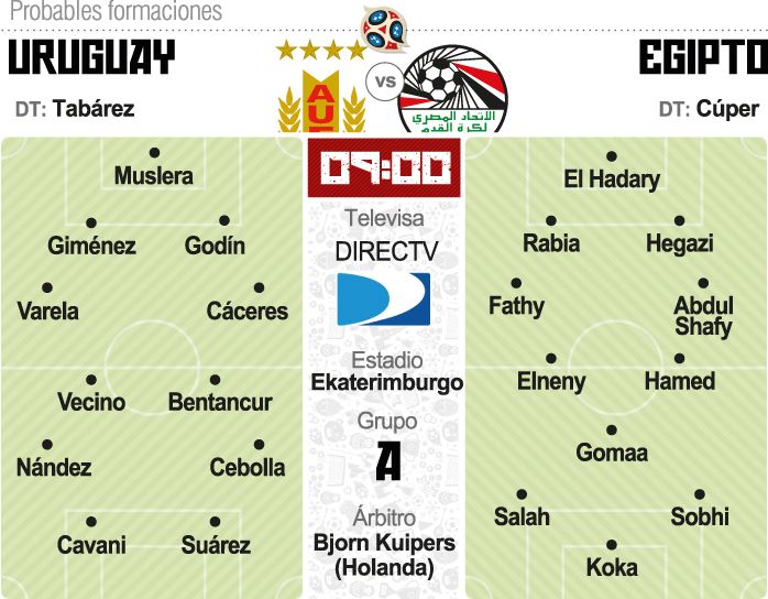 Con el gran debut de Rusia en el Grupo A y sabiendo que el primer paso es clave hoy -desde las 9- Egipto y Uruguay se ven las caras en el Ekaterinburg Arena en un partido donde ambas selecciones buscarán comenzar con el pie derecho su participación en el Mundial de Rusia 2018. Para este encuentro se espera el regreso de Mohamed Salah, la gran figura de los ‘faraones’, quien no ve acción desde la final de la Champions League donde salió por lesión ante Real Madrid. Eso sí, cabe consignar que el entrenador Héctor Cúper no confirmó la presencia del delantero del Liverpool como titular, pero sí es un hecho que ya está recuperado y que a lo menos irá al banco de suplentes.