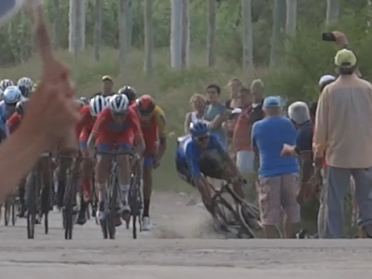 En la imágenes que se recolectaron de tres cámaras y ángulos diferentes, se ve cómo el pedalero pisa banquina y al poco andar se precipita al suelo con violencia por la velocidad que llevaba. Cabe destacar que se estaba desarrollando el sprint final, por lo que la velocidad que habían alcanzado era importante.