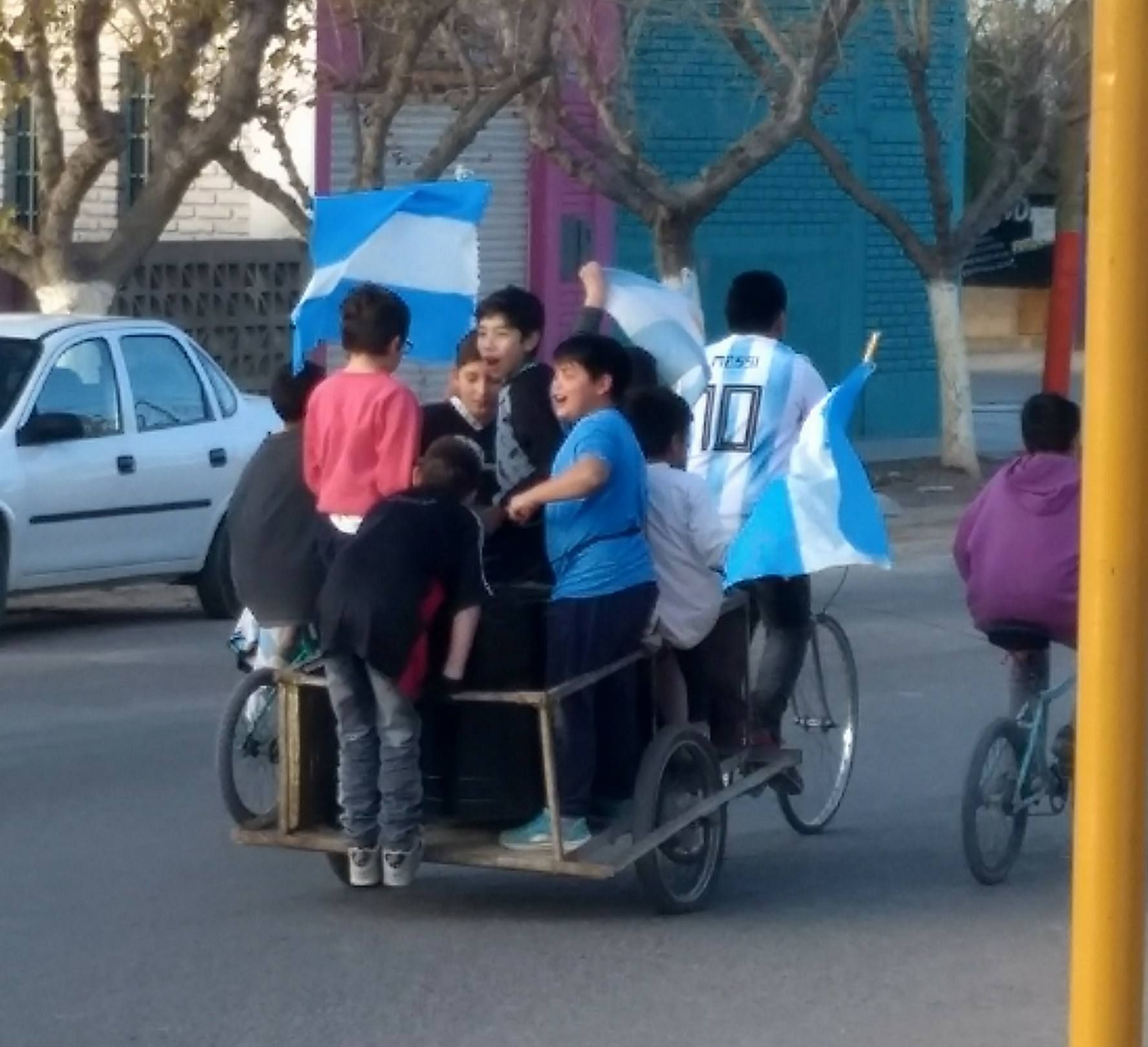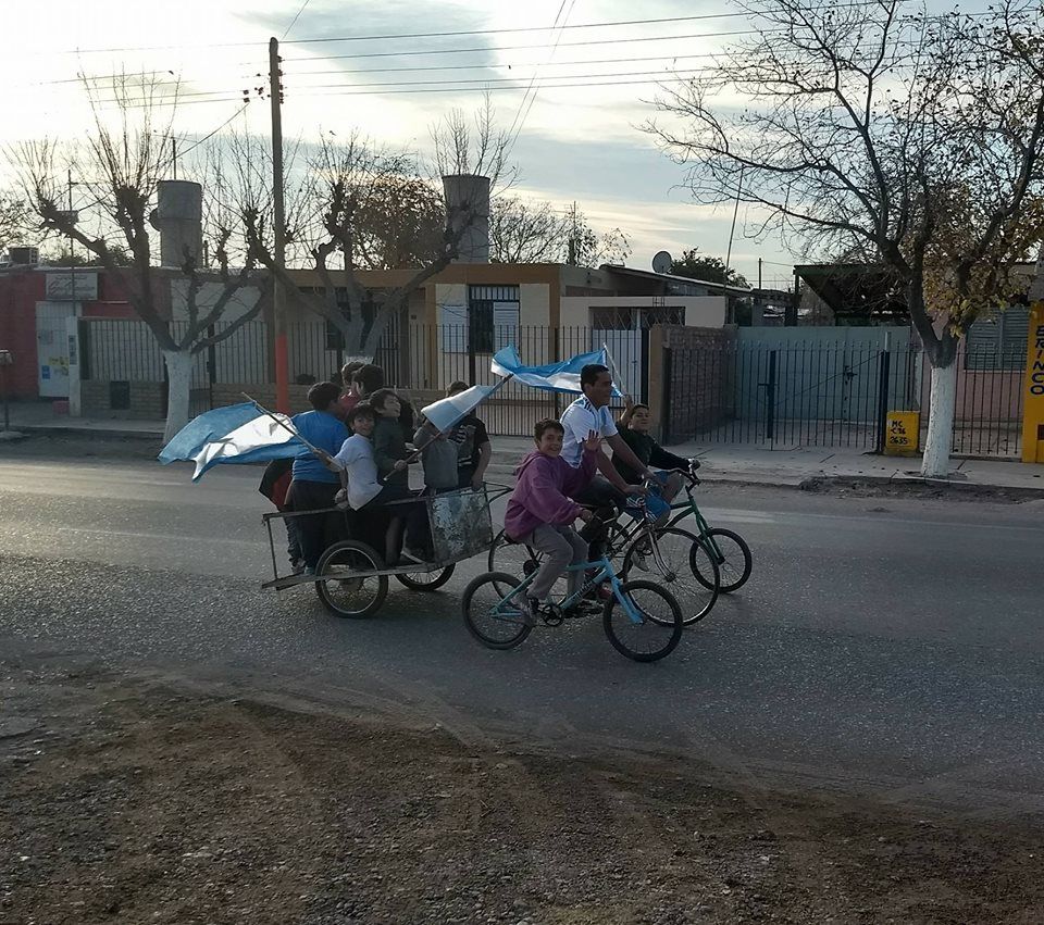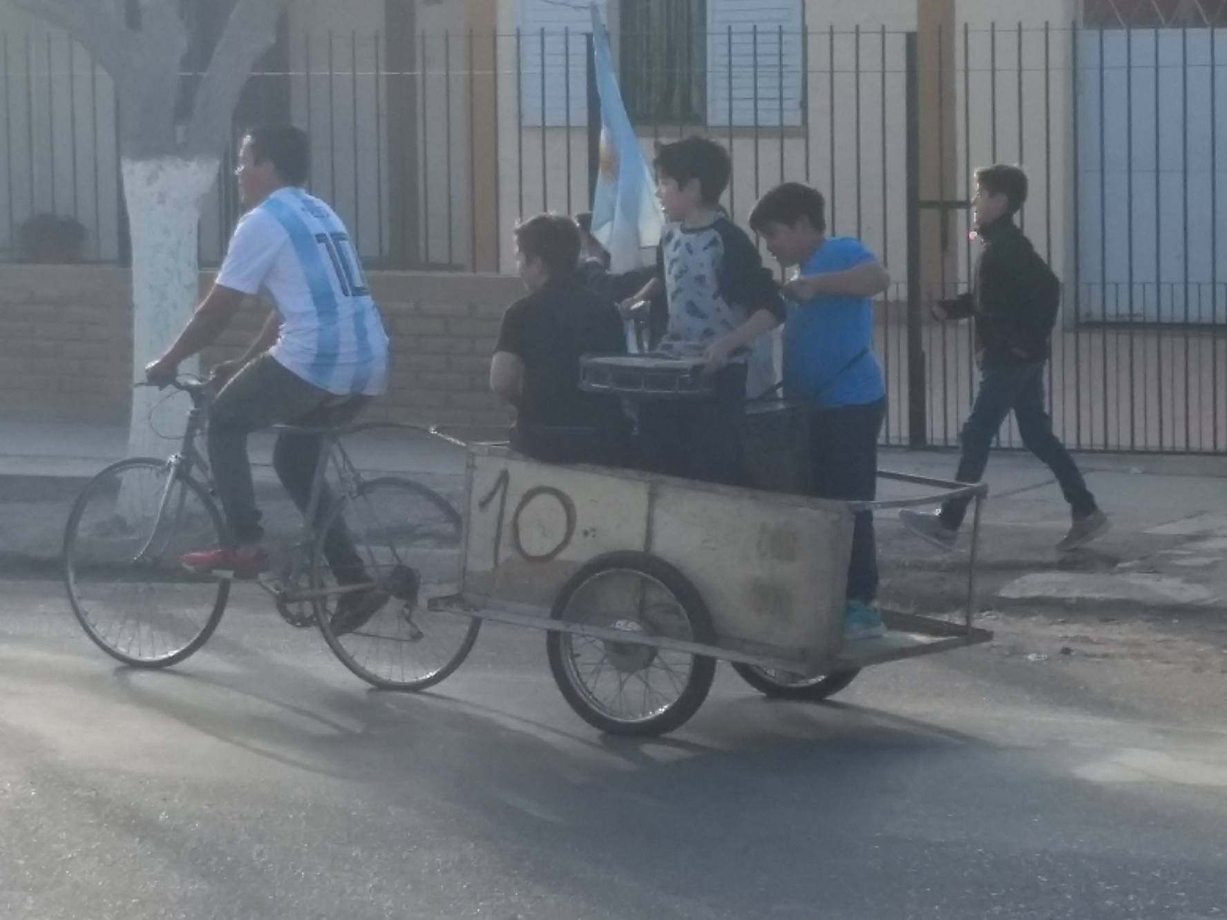 Claro, lo hicieron a su manera, con lo que tenían a mno. Agarraron un carrito tirado por una vieja bicicleta, se subieron varios chicos y agarraron calle 25 de Mayo a puro grito y el ruido de un redoblante. Un ’10’ pintado con carbón, un detalle que ¡Qué viva el fútbol!