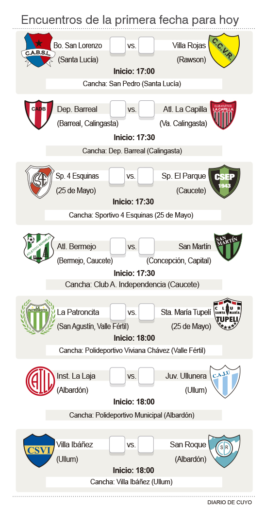 Pero claro, el capítulo especial de este inicio de torneo se lo lleva Valle Fértil. Uno de los departamentos que más apostó al deporte desde la aparición de la atleta olímpica Viviana Chávez como movilizadora. Así, se metió en el ciclismo, en el handbol y ahora, volviendo a pedir lugar en el fútbol. Hubo un trabajo cuidadoso en el Polideportivo y hoy ofrecerá un campo de juego excepcional que confirma que los vallistos quieren ser parte de la Copa pero de verdad. Luego del acto inaugural vendrá el fútbol y el debut de La Patroncita ante Tupelí. Completando el panorama de este sábado de Copa, por el Grupo 1 en Barreal, el Deportivo será local a partir de las 17,30 de Atlético La Capilla de Calingasta. Por el Grupo 3, en el Polideportivo de Campo Afuera, Instituto La Laja debutará recibiendo desde las 18 a Juventud Ullunera. Por el Grupo 4, toda la actividad será este sábado cuando Barrio San Lorenzo reciba a Villa Rojas y Villa Ibañez sea local de Deportivo San Roque. Por el Grupo 7, Cuatro Esquinas será local recibiendo a El Parque, de Caucete. Finalmente, por el Grupo 8 y en cancha de Villa Independencia, Vecinal Bermejo jugará ante Atlético San Martín.