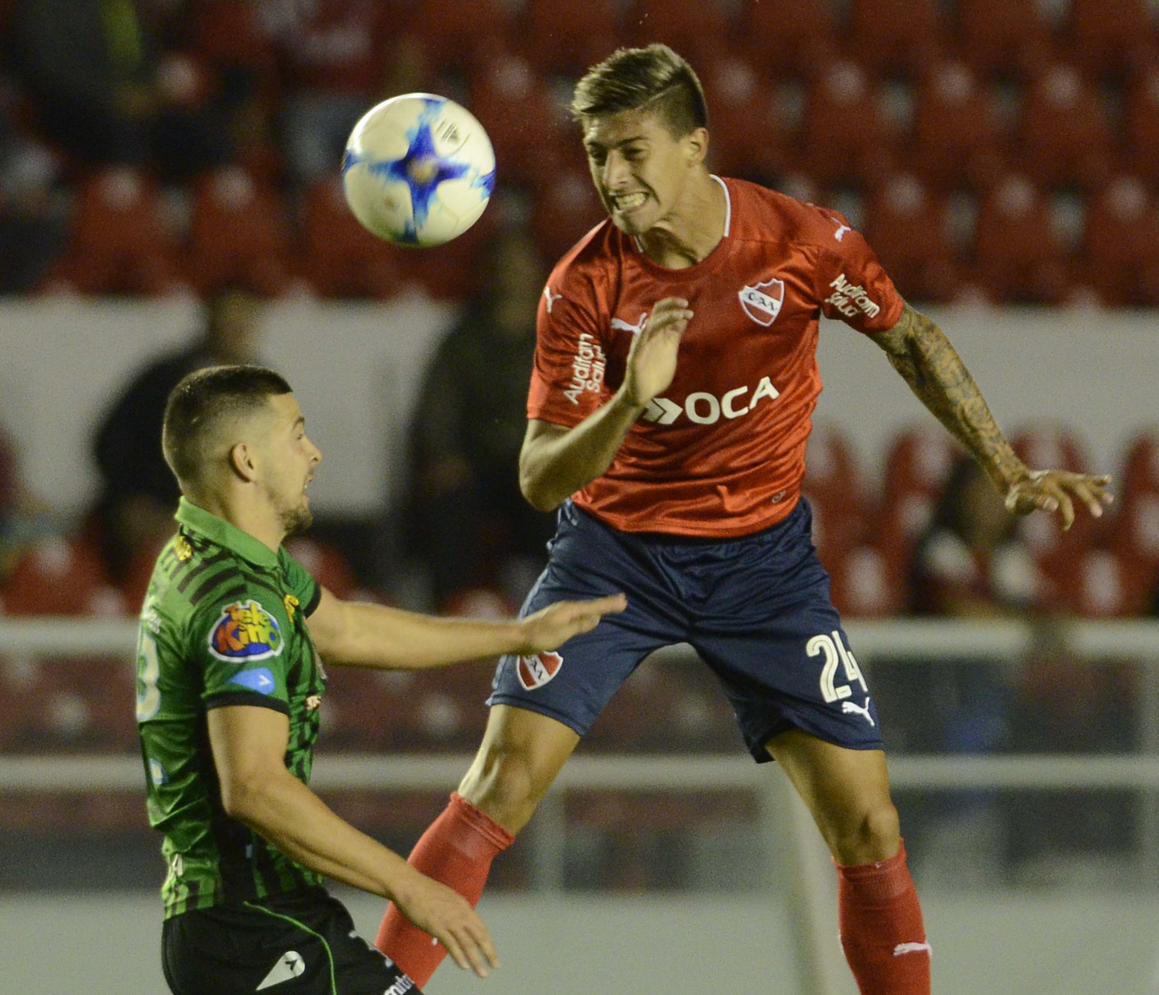 Por arriba. Emiliano Rigoni se eleva y supera Ezequiel Videla para meter el cabezazo. El Rojo fue más que San Martín, pero no tuvo capacidad ni fortuna en la definición.