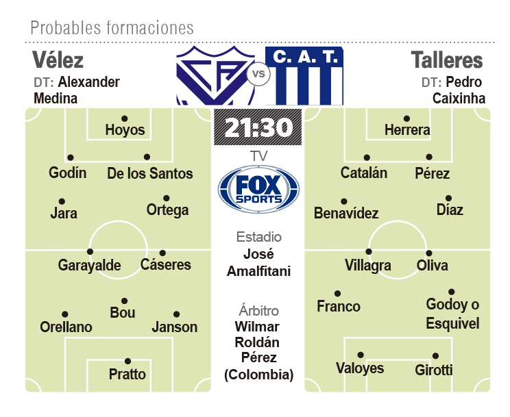Vélez Sarsfield recibirá hoy a Talleres de Córdoba por la ida de los cuartos de final de la Copa Libertadores de América. El partido se disputará desde las 21.30 en el estadio José Amalfitani de Liniers, con arbitraje del colombiano Wilmar Roldán y transmisión de Fox Sports.
