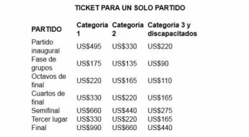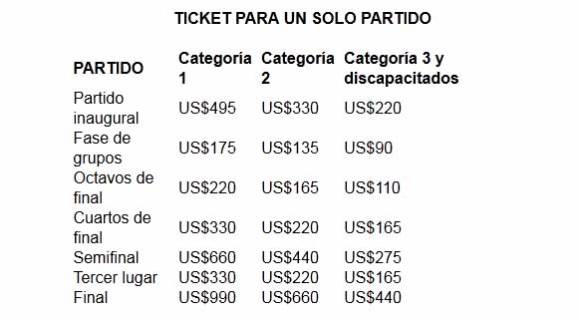 Los tickets de Categoría 2, 3 y discapacitados, generalmente detrás de los arcos, son más accesibles. Aunque serán los que más entrarán en el bolillero. Un boleto en esas categorías se conseguirá a un valor de entre US$90 y US$135 por partido en la fase de grupos. Y en el partido final saldrá US$440 y US$660. Para ver los tres partidos de una misma selección en la primera ronda, el valor será de US$297 y US$ 446.