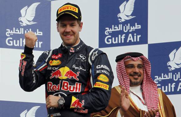 El alemán Sebastian Vettel, bicampeón actual de Fórmula 1, ganó ayer el Gran Premio de Bahrein, disputado a 57 vueltas en el autódromo de la ciudad de Sakhir, de 5.412 metros de extensión, por la cuarta fecha de la temporada. Detrás del piloto del equipo Red Bull, líder de las posiciones generales, completaron el podio el finlandés Kimi Raikkonen y el francés Romain Grosjean, ambos con Lotus.