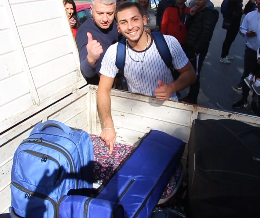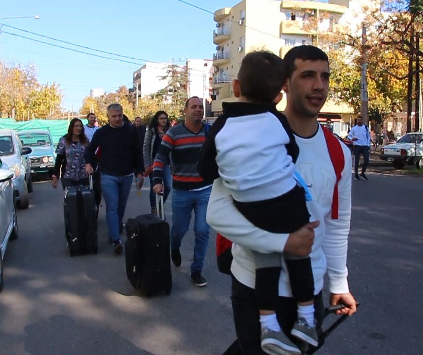 A guardar. El momento de guardar las valijas en el carrito que llevaba la combi. En la fila van Lucas Ordoñez, el profe Sergio Clavel y el “Negro” Páez. Rodeados por familiares.