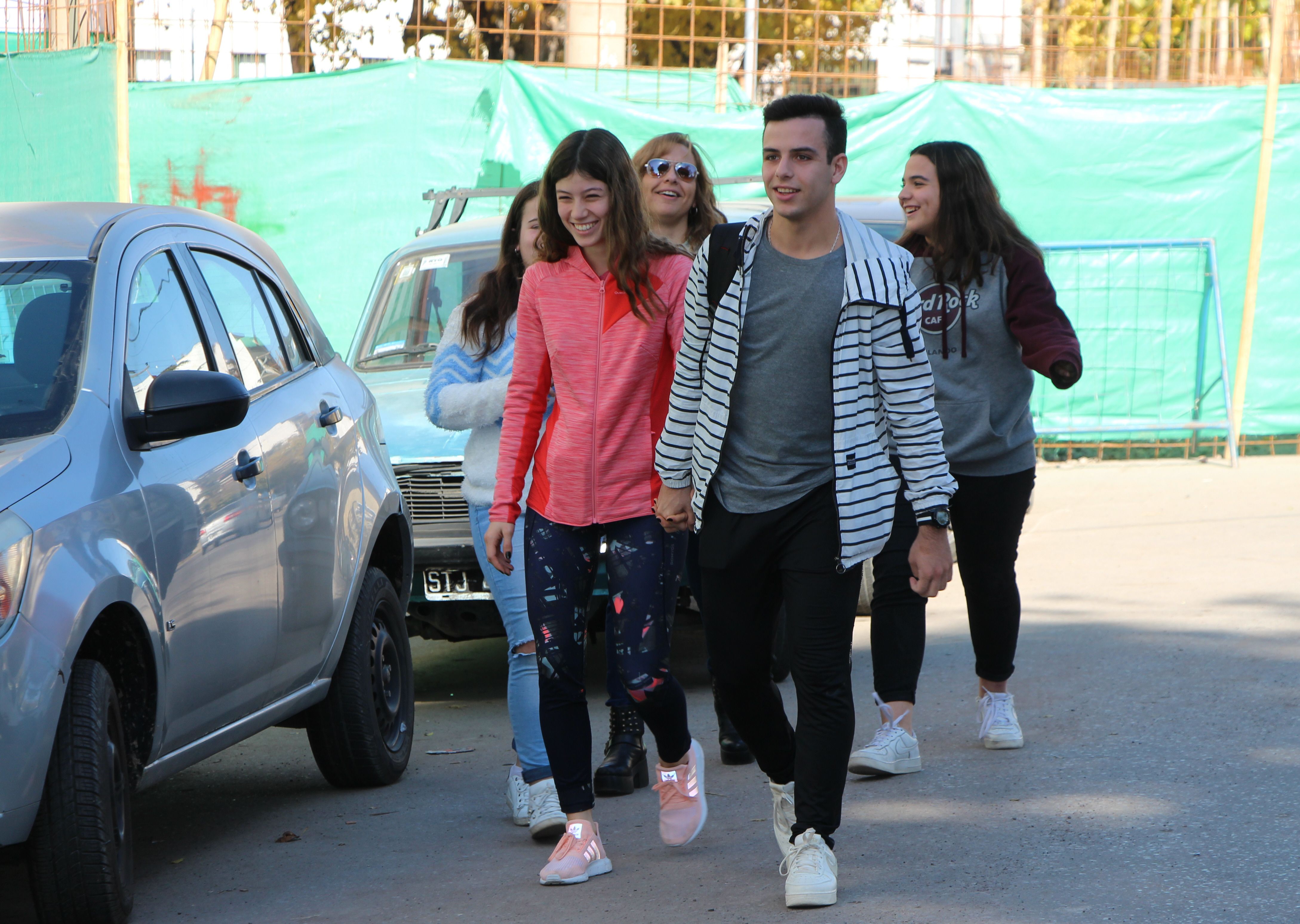 Último en llegar. El juvenil Ezequiel Mena a las disparadas delante de su familia. Fue el último en llegar y recibió las cargadas de rigor.