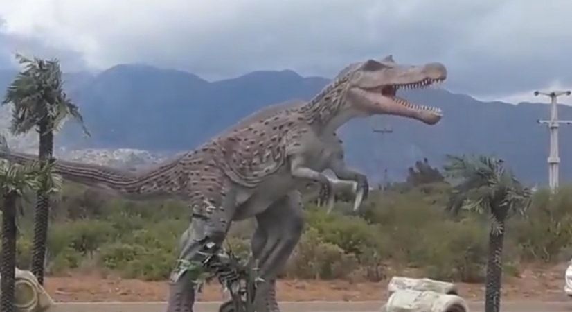 La reproducción realista, que es parte de la muestra “Living Dinosaurs” que se expuso en el Centro Cultural Conte Grand, fue instalada a un lado de la Ruta Nacional 150, antes de su intersección con la Ruta Provincial 510, y causó sorpresa entre los equipos y el público.