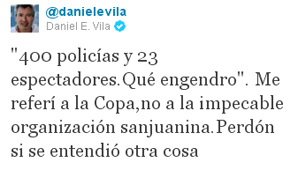 Hoy, se desdijo de sus propios dichos y aseguró que algunos políticos sanjuaninos lo “malinterpretaron”. "400 policías y 23 espectadores. Qué engendro. Me referí a la Copa, no a la impecable organización sanjuanina. Perdón si se entendió otra cosa", twitió esta mañana y más tarde agregó: “Algún funcionario del Gob. sanjuanino lo malinterpretó”.