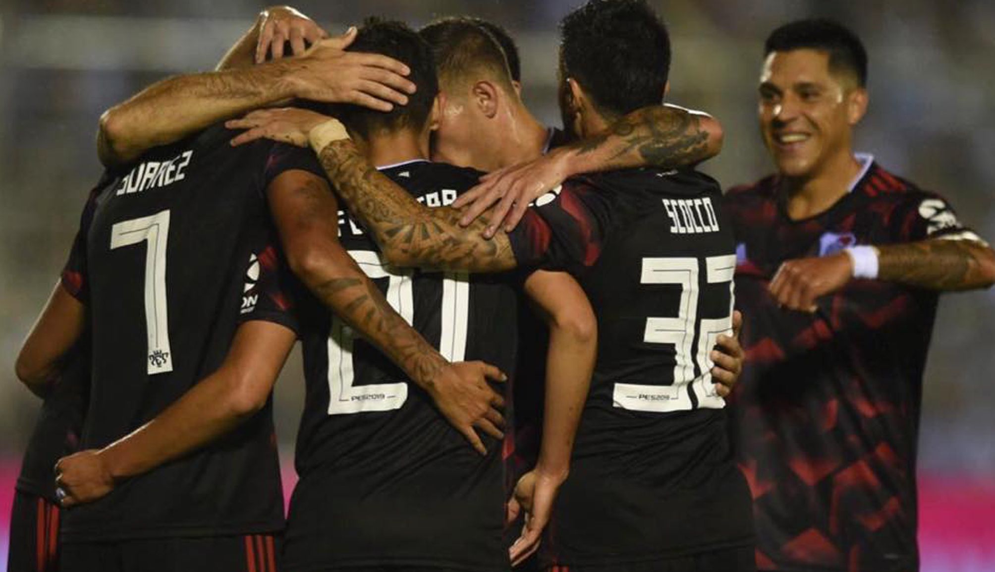 Abrazo grupal. El pibe Ferreira ya anotó el gol de River, a la postre el del triunfo millonario, y sus compañeros lo abrazan. El equipo del “Muñeco” Gallardo logró un triunfo fundamental para su objetivo de clasificar a la Libertadores 2020.
