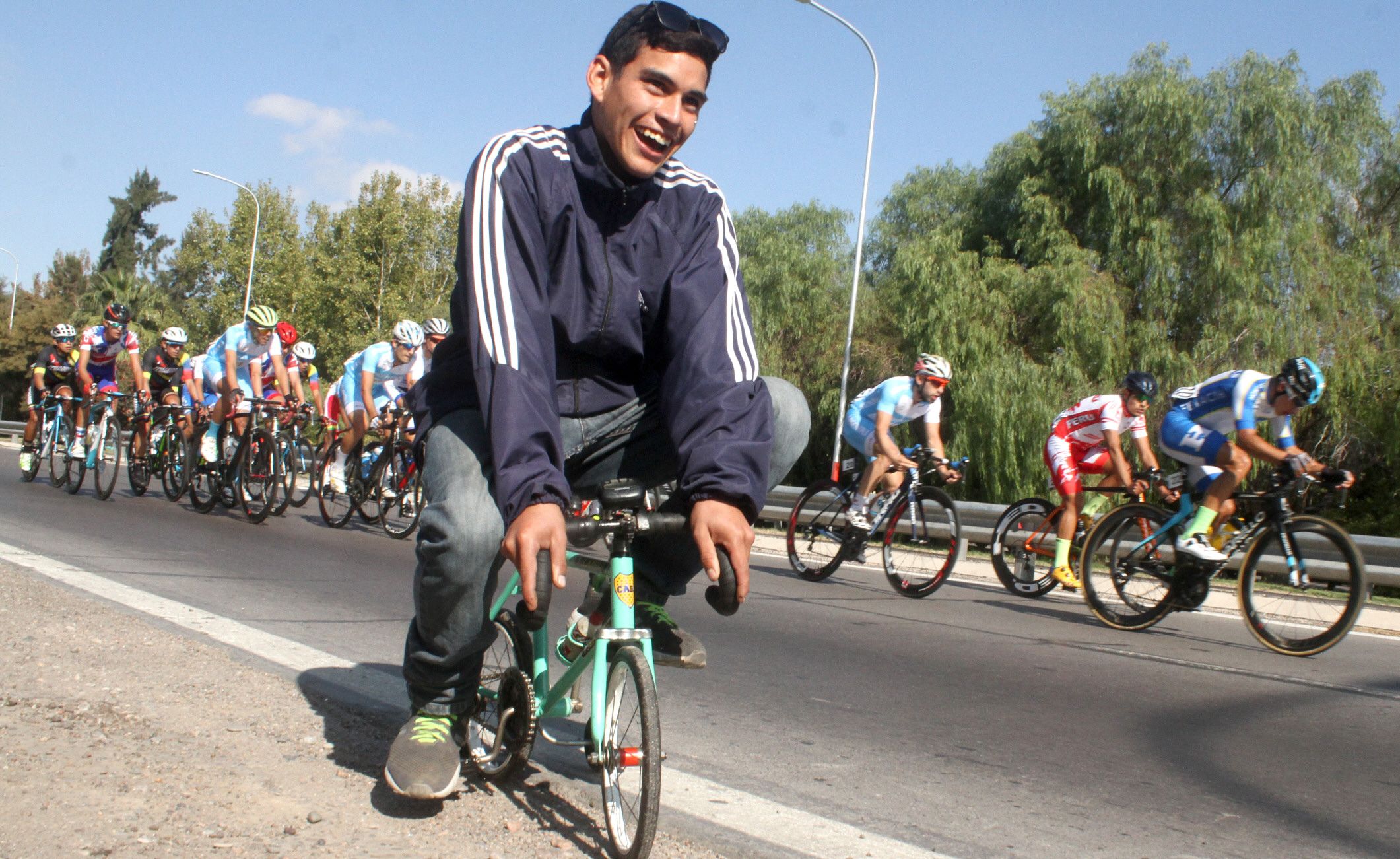 La felicidad en dos ruedas. Mientras el pelotón Sub 23 pasa por detrás, Nicolás Valdez se divierte en su pequeña bicicleta y marcha junto a los profesionales. La "mini-bici" fue diseñada por Javier Velárdez, padre del "Colo", ciclista sanjuanino que integró la Selección Argentina Sub-23.
