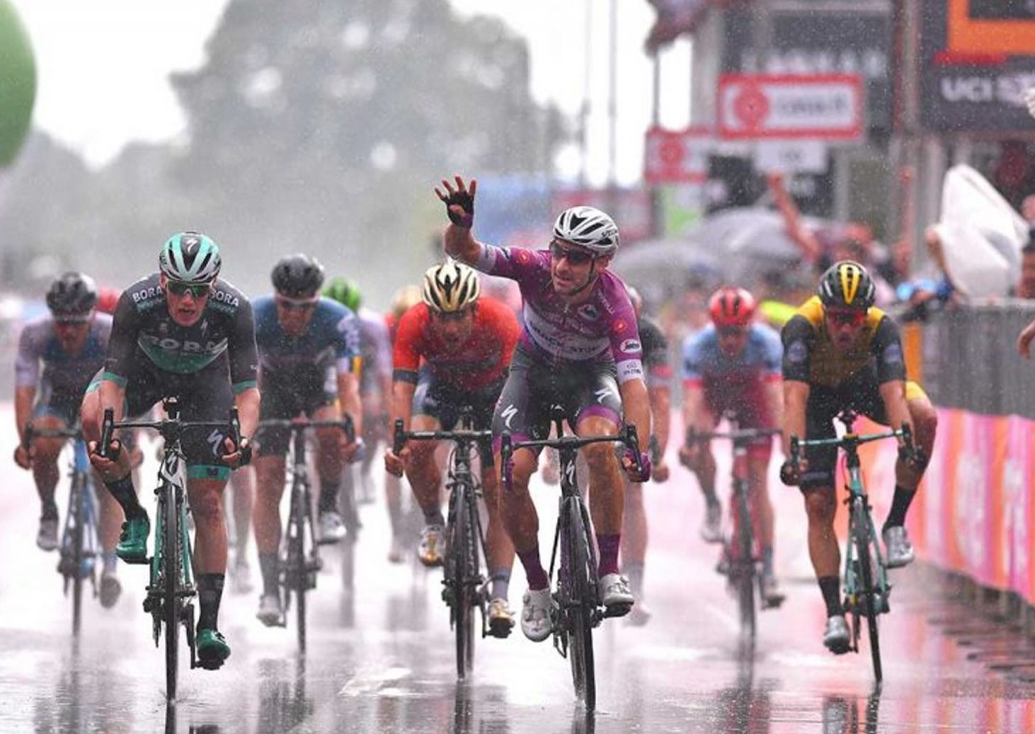 Por cuarta vez, el italiano Elia Viviani festeja la victoria de una etapa en e actual Giro, su victoria embalando no modificó en nada la general.