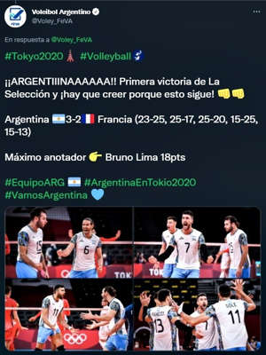 El seleccionado argentino masculino de vóleibol obtuvo este miércoles por la madrugada un triunfo clave por 3-2 ante su par de Francia, en resultado que le permite albergar esperanzas de ingresar a los cuartos de final en los Juegos Olímpicos de Tokio 2020. El sanjuanino Bruno Lima, máximo anotador del partido junto al equipo que también integran los comprovincianos Nicolás Sánchez y Federico Pereyra.
