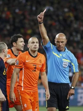 Pobre desempeño de Howard Webb en la final del Campeonato Mundial. El árbitro inglés, policía de profesión, demostró no estar a la altura de un partido así. ¿Sus errores principales? No se atrevió a expulsar a los holandeses Van Bommel y De Jong -ambos ya con tarjetas amarillas-, se comió un penal clarísimo de Heitinga sobre el español Xavi Hernández en tiempo suplementario y, por último, el gol de España llegó precedido de un córner a favor de Holanda que no dio.