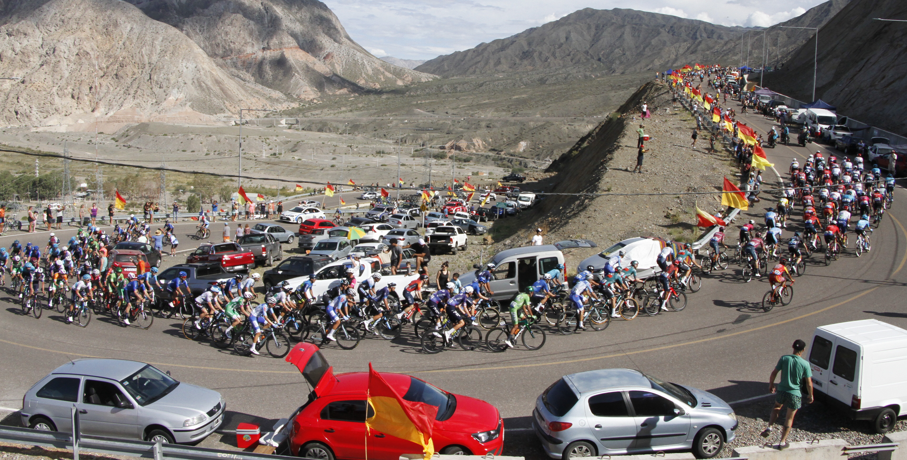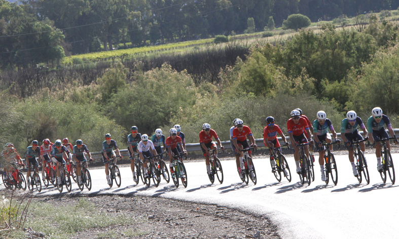 El pelotón… encara la última curva en la subida al “caracol” del paredón del Dique Punta Negra. Por entonces, el ritmo era tranquilo, iban siete escapados y en el grupo dejaban que la diferencia se extendiera a más de 2 minutos. En el descenso, comenzó una serena, pero constante persecución, que se concretó en los últimos 20 kilómetros de carrera.