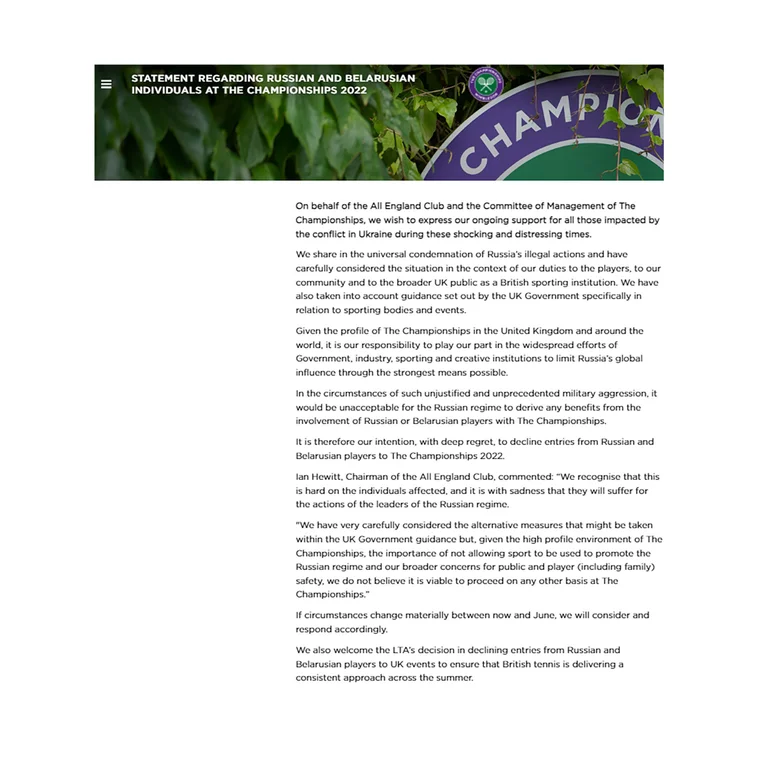 La información fue difundida primeramente por el diario británico The Times y desde el New York Times habían aportado que la prohibición, que convertiría al Grand Slam británico en el primer evento de tenis en restringir la competencia de atletas individuales rusos y bielorrusos, había sido confirmada por un funcionario de tenis internacional de alto rango que habló bajo condición de anonimato porque no estaba autorizado a hablar en nombre de la All England Club, que organiza y alberga el torneo.