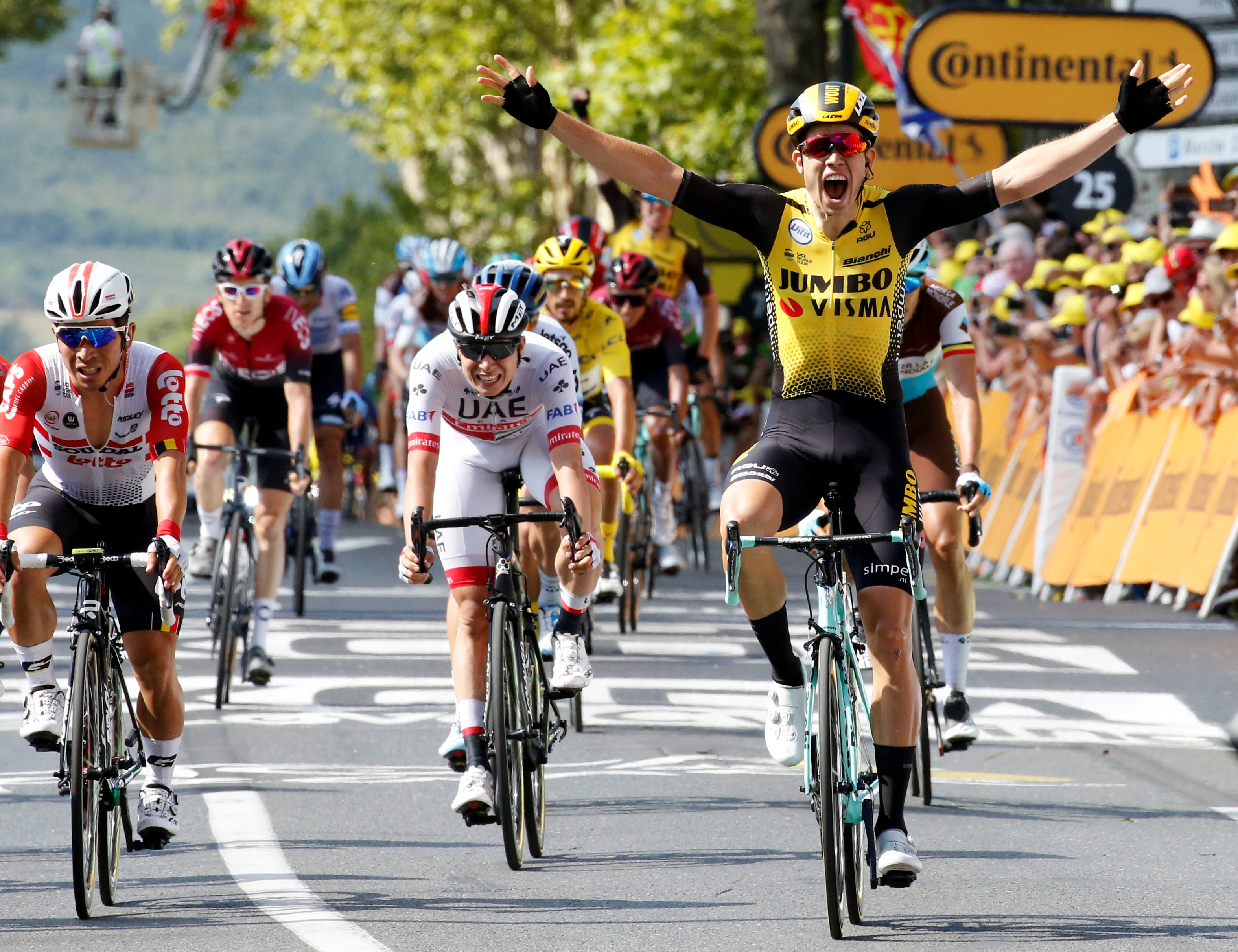 El todoterreno belga Wout Van Aert (Jumbo Visma), triple campeón del mundo de ciclocross, se bautizó en el Tour de Francia levantando los brazos en una etapa marcada por los abanicos que castigaron a varios favoritos, la caída que le hizo perder más de 2 minutos a Mikel Landa y la toma de posiciones de Geraint Thomas y Egan Bernal (Ineos) como claros favoritos.